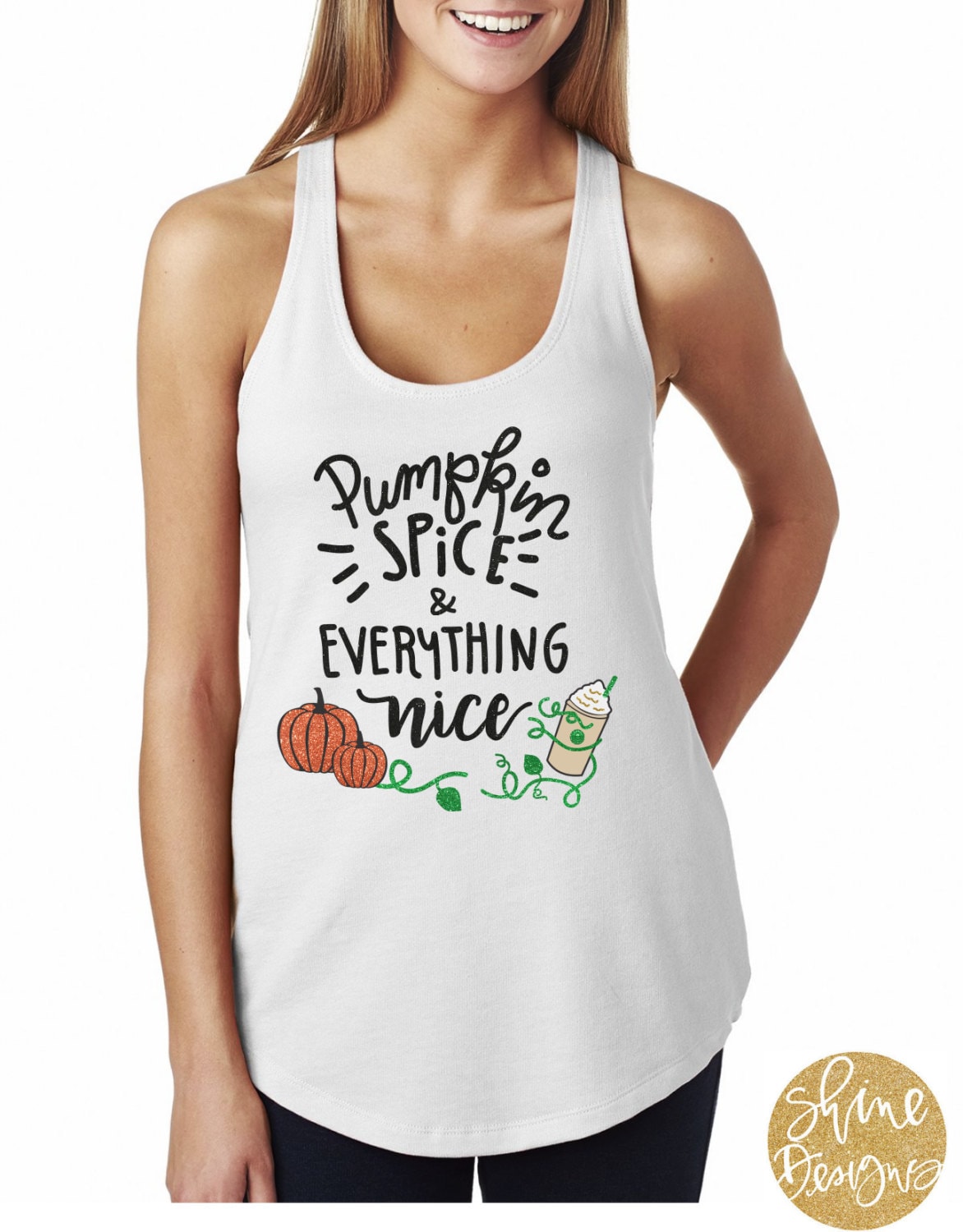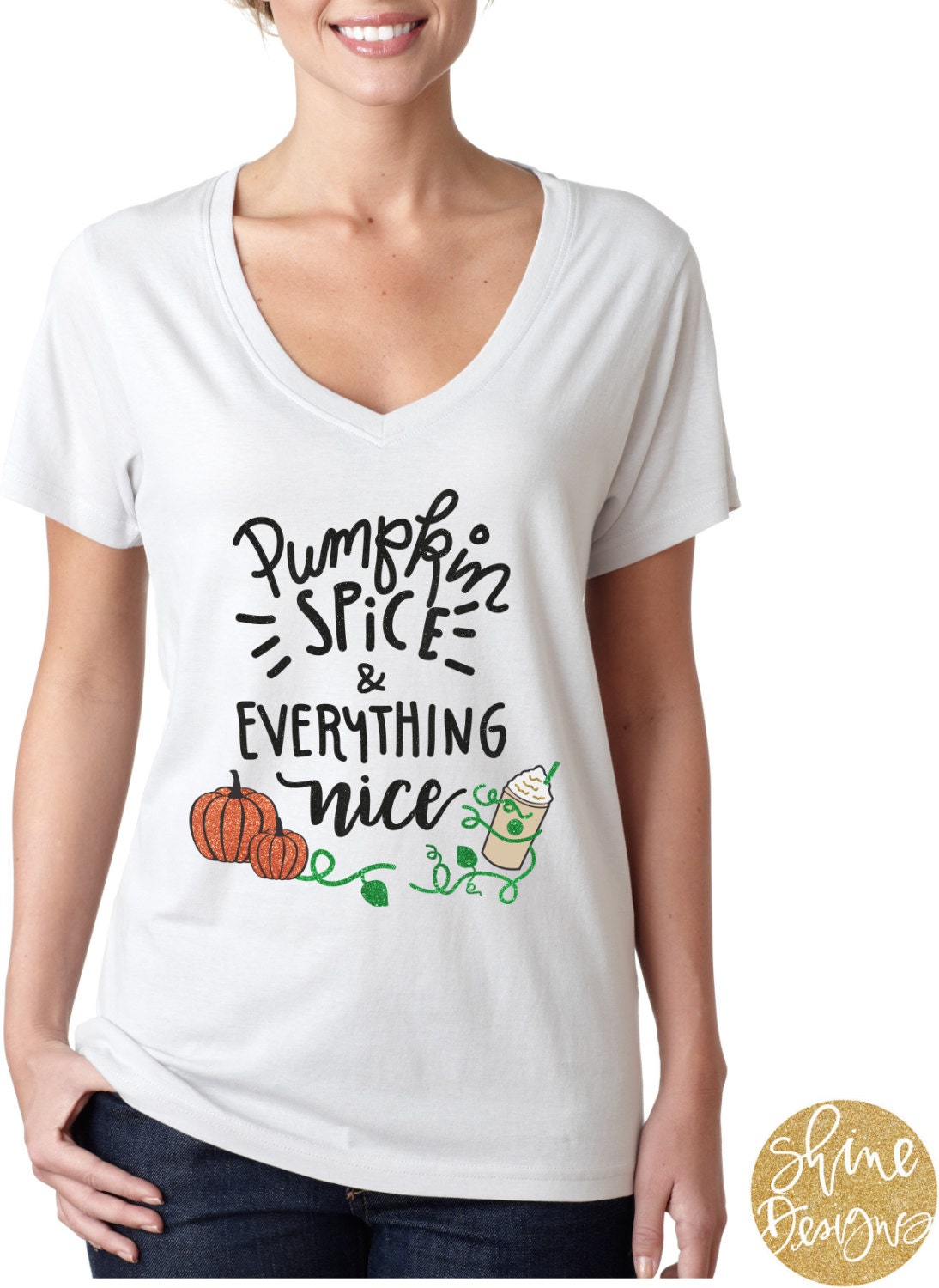 For those of you who love the pumpkin spice, this is the perfect fall shirt for you! This design is completed with solid and glitter textures. This design comes on a white shirt, you choose the style!