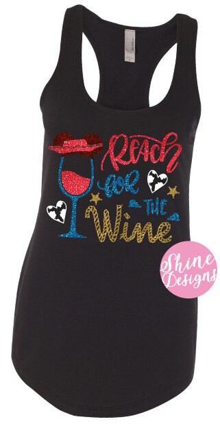 For those who Reach For The Wine! This is the perfect shirt for Food and Wine Festival!! This glitter design comes on a black colored shirt, you choose the style!